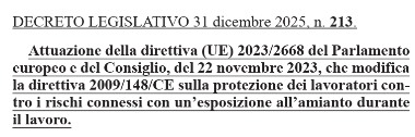 Il 9 gennaio 2026 è stato pubblicato il D.Lgs. 31 dicembre 2025, n. 213, che recepisce la Direttiva UE 2023/2668 sulla protezione dei lavoratori dai rischi connessi all’esposizione all’amianto durante il lavoro (GU Serie Generale n. 6 del 09-